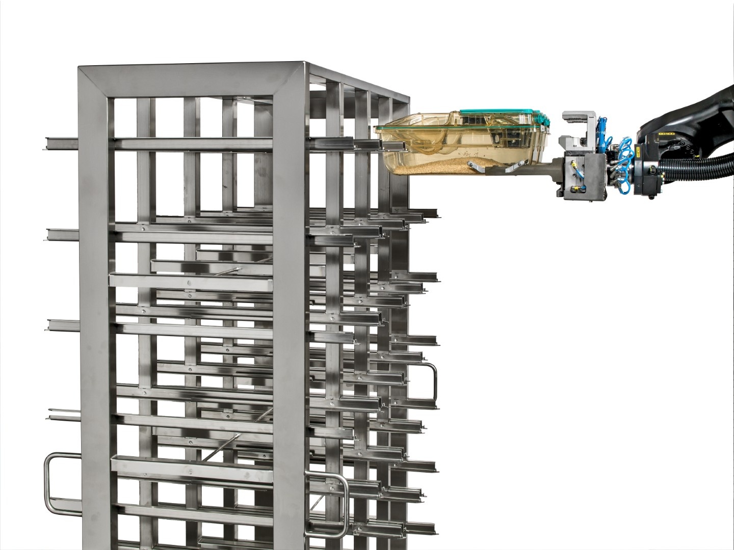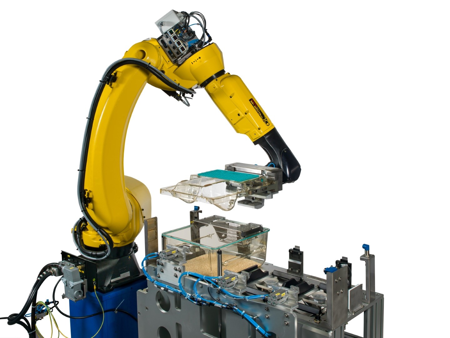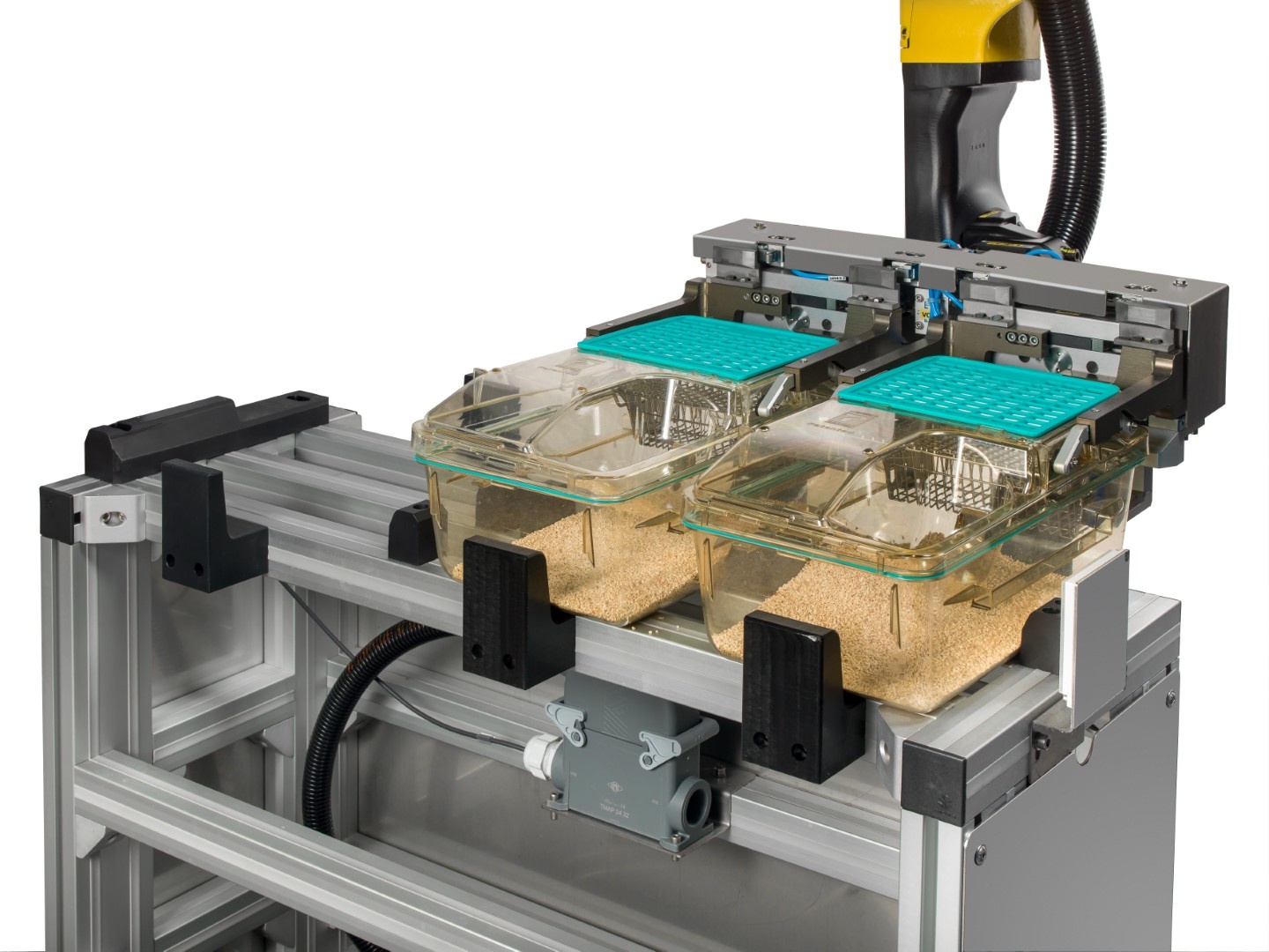 Robot wyposażony jest w dedykowane chwytaki umożliwiające jednoczesne przenoszenie dwóch klatek mysich lub jednej klatki szczurzej. System automatycznie rozpoznaje obecność klatek, ich orientację oraz kompletność elementów, co pozwala na płynną i bezbłędną pracę bez przestojów. Modułowy układ umożliwia również automatyczną zmianę chwytaków przy obsłudze różnych typów klatek.