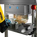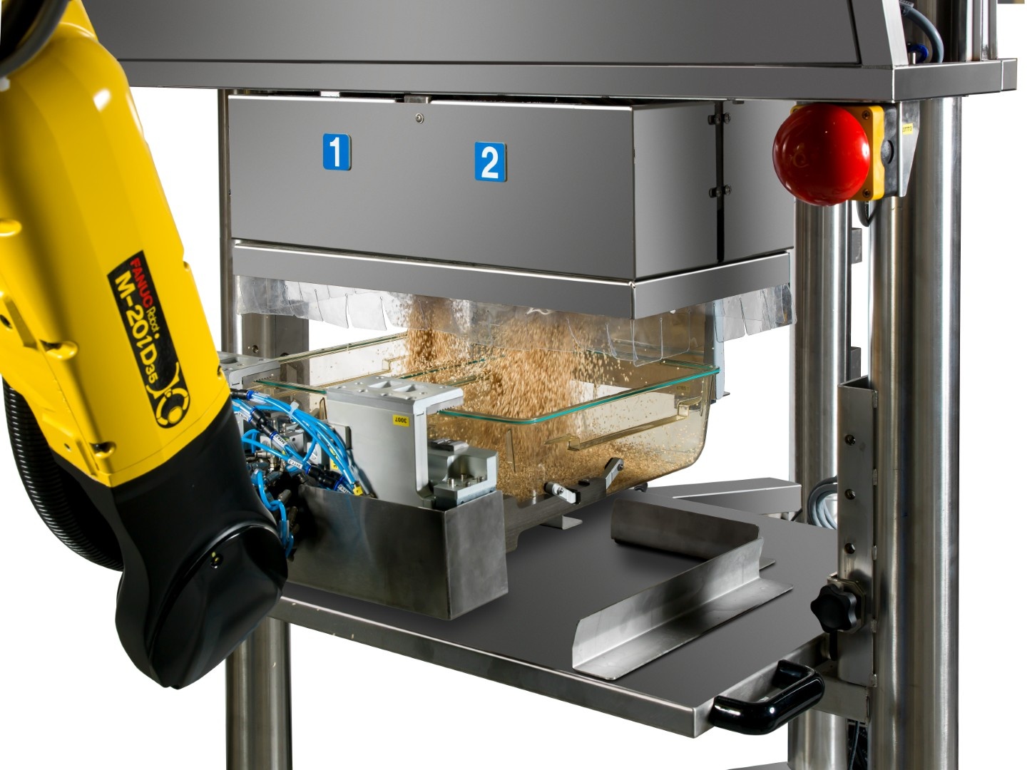 Zastosowanie pełnej automatyzacji pozwala ograniczyć ręczne czynności do minimum – operator obsługuje jedynie logistykę wózków transportowych. Zamknięte klatki oraz praca robota w strefie bezobsługowej skutecznie redukują ekspozycję na alergeny i poprawiają warunki BHP. System spełnia wysokie wymagania ergonomiczne, szczególnie istotne w obiektach o dużym wolumenie pracy.