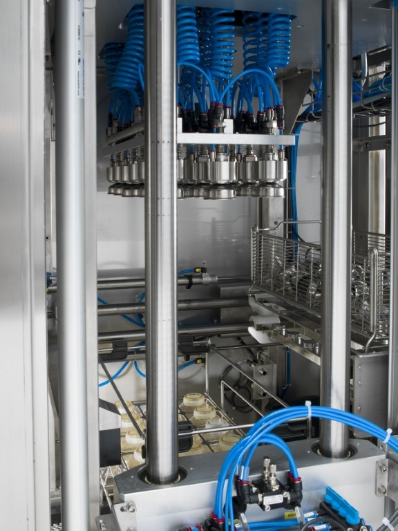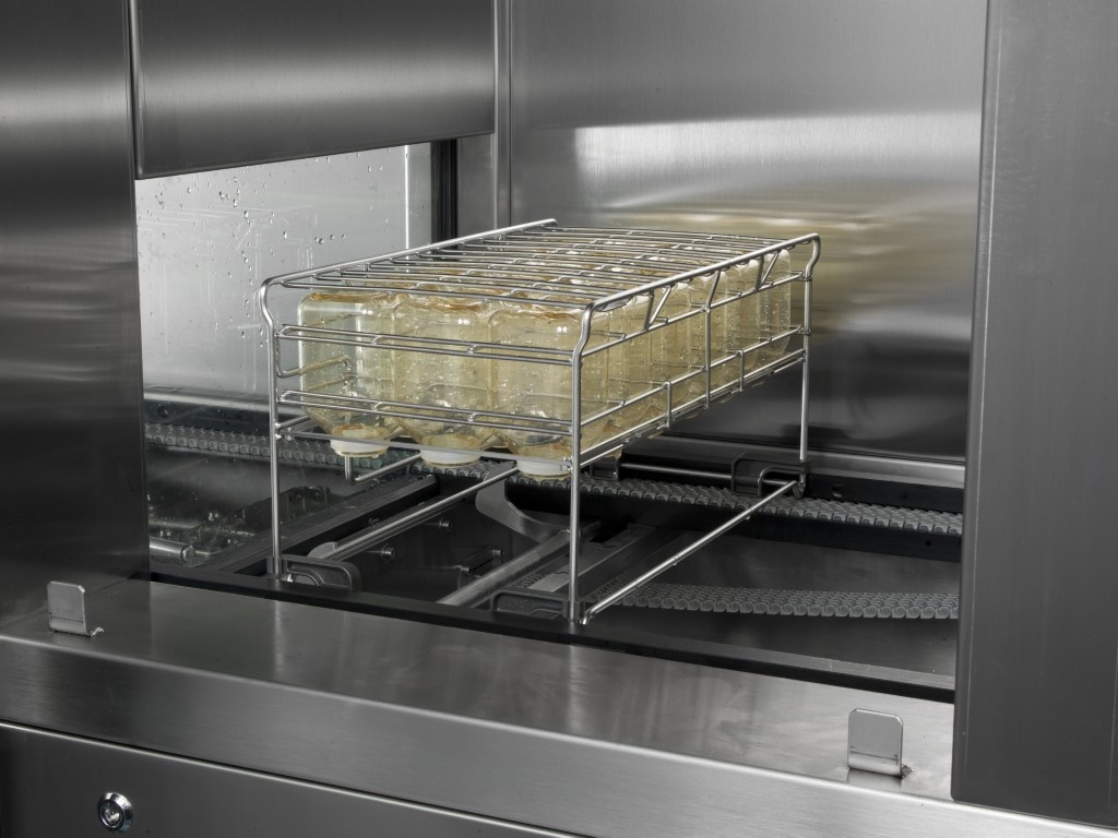 S-LINE umożliwia mycie 36 butelek na cykl, wykorzystując technologię mycia pojedynczą dyszą, gwarantującą powtarzalne i skuteczne rezultaty. Ergonomiczne wymiary robocze oraz dostępne stoły buforowe znacząco usprawniają załadunek i rozładunek, redukując obciążenie operatorów.