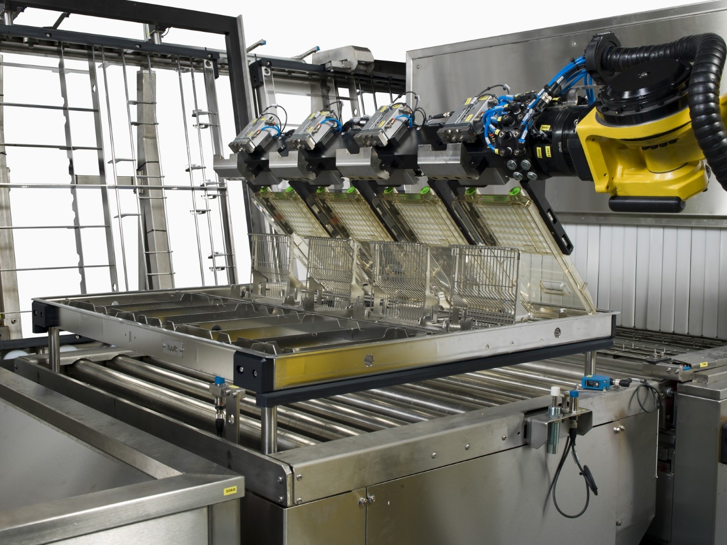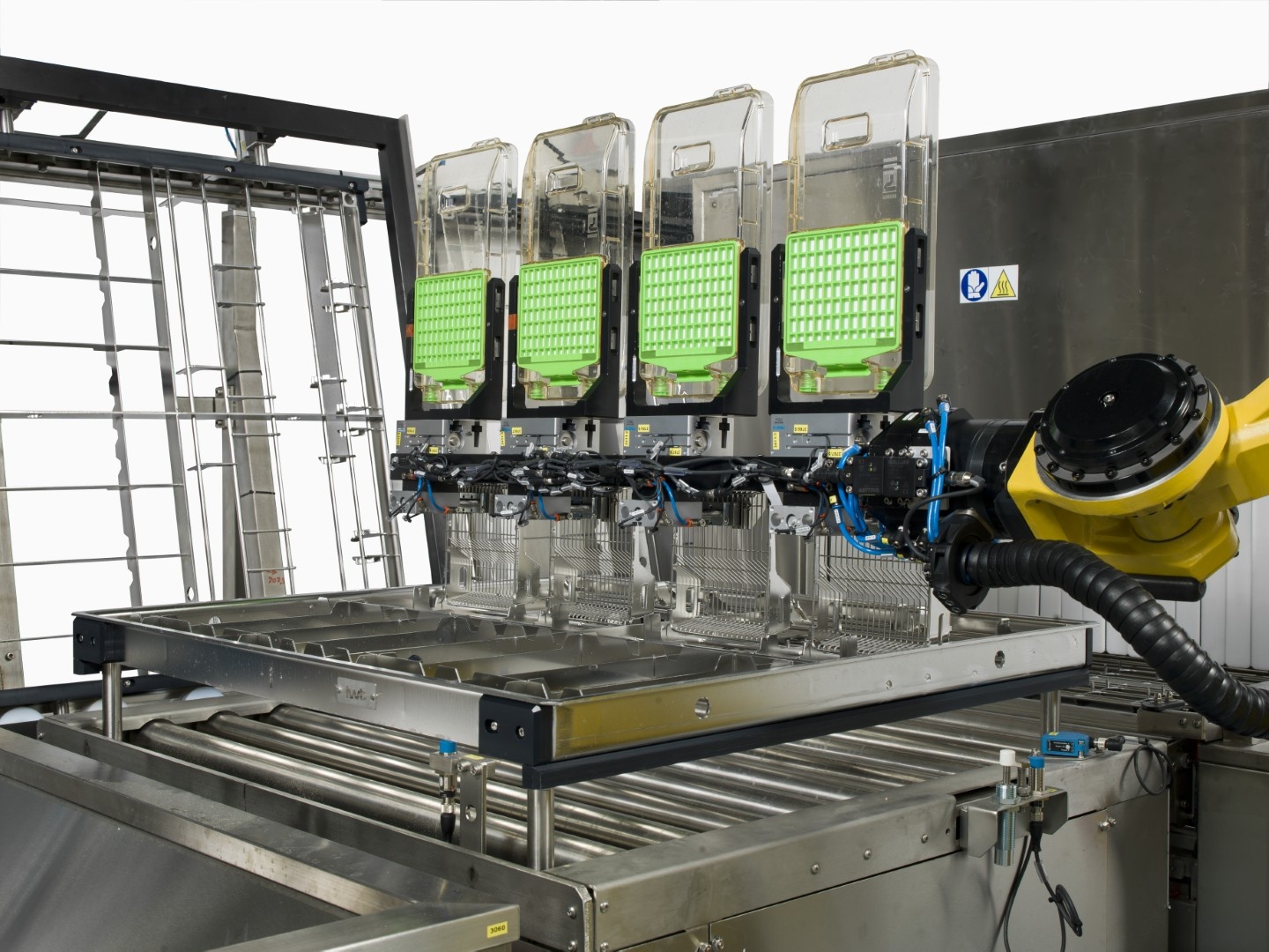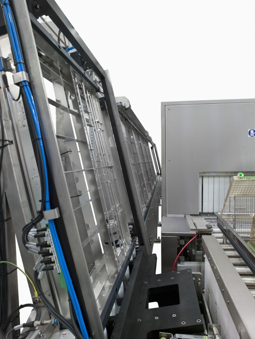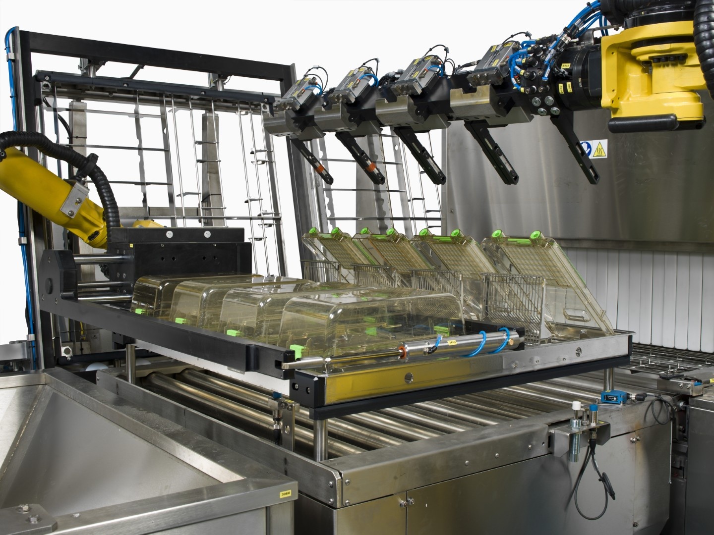 COSMOS współpracuje bezpośrednio ze zmywarką tunelową, która realizuje mycie, płukanie i suszenie elementów klatek. Po zakończeniu procesu robot przejmuje obsługę strony czystej – przekazuje podstawy do systemu dozowania ściółki, precyzyjnie je napełnia, a następnie automatycznie składa kompletne zestawy klatek i odkłada je na czyste wózki transportowe. Cały proces odbywa się w sposób powtarzalny, kontrolowany i w pełni zautomatyzowany.