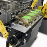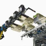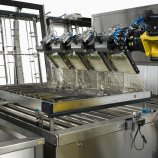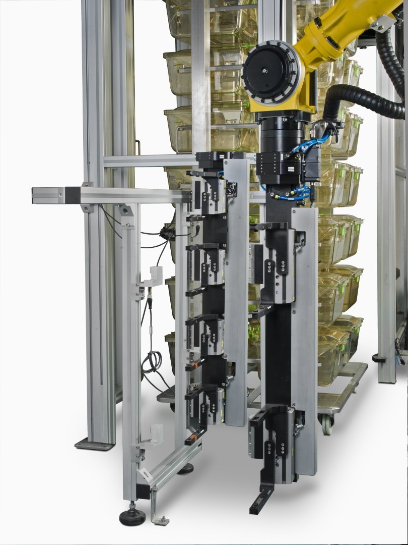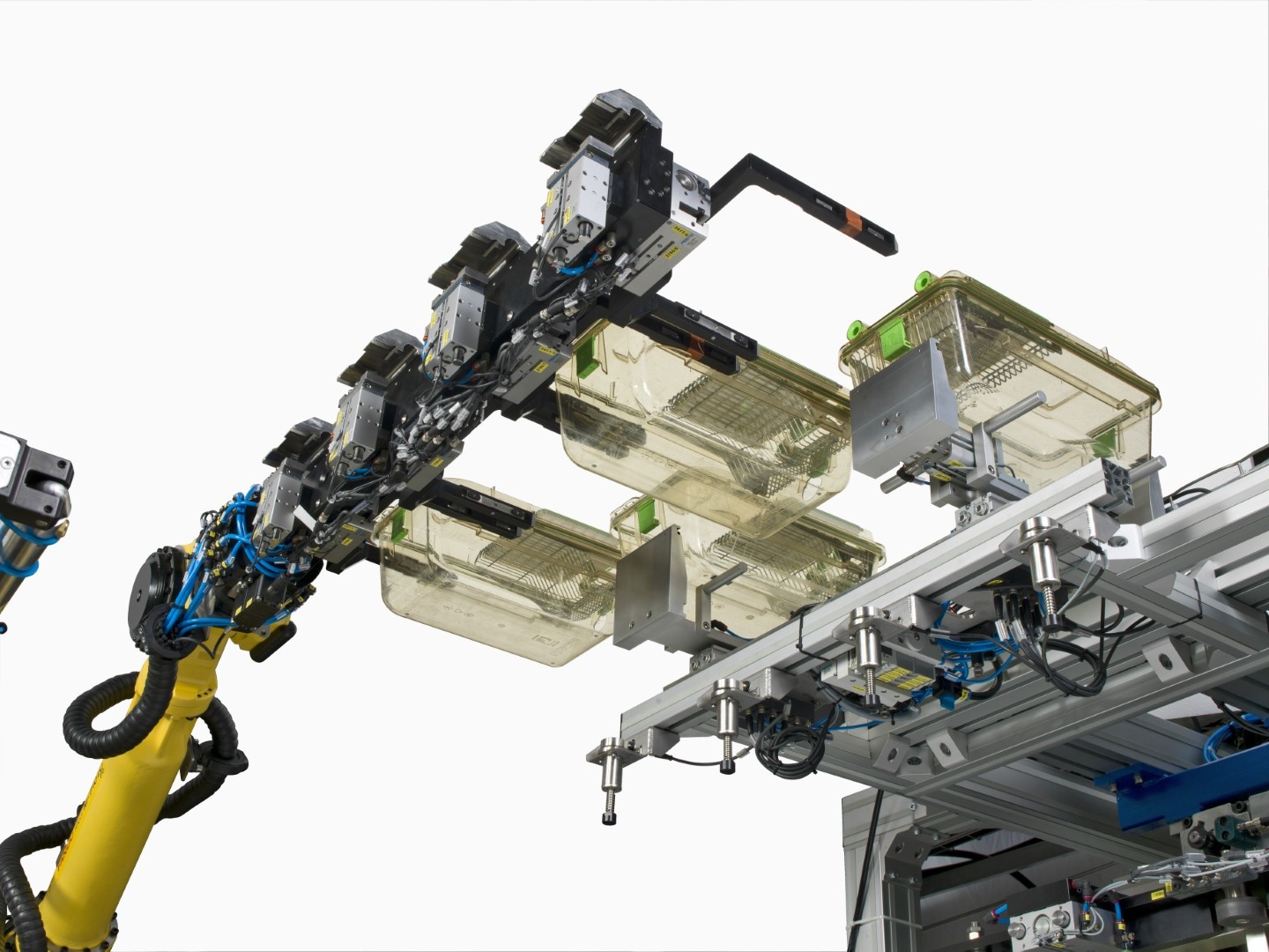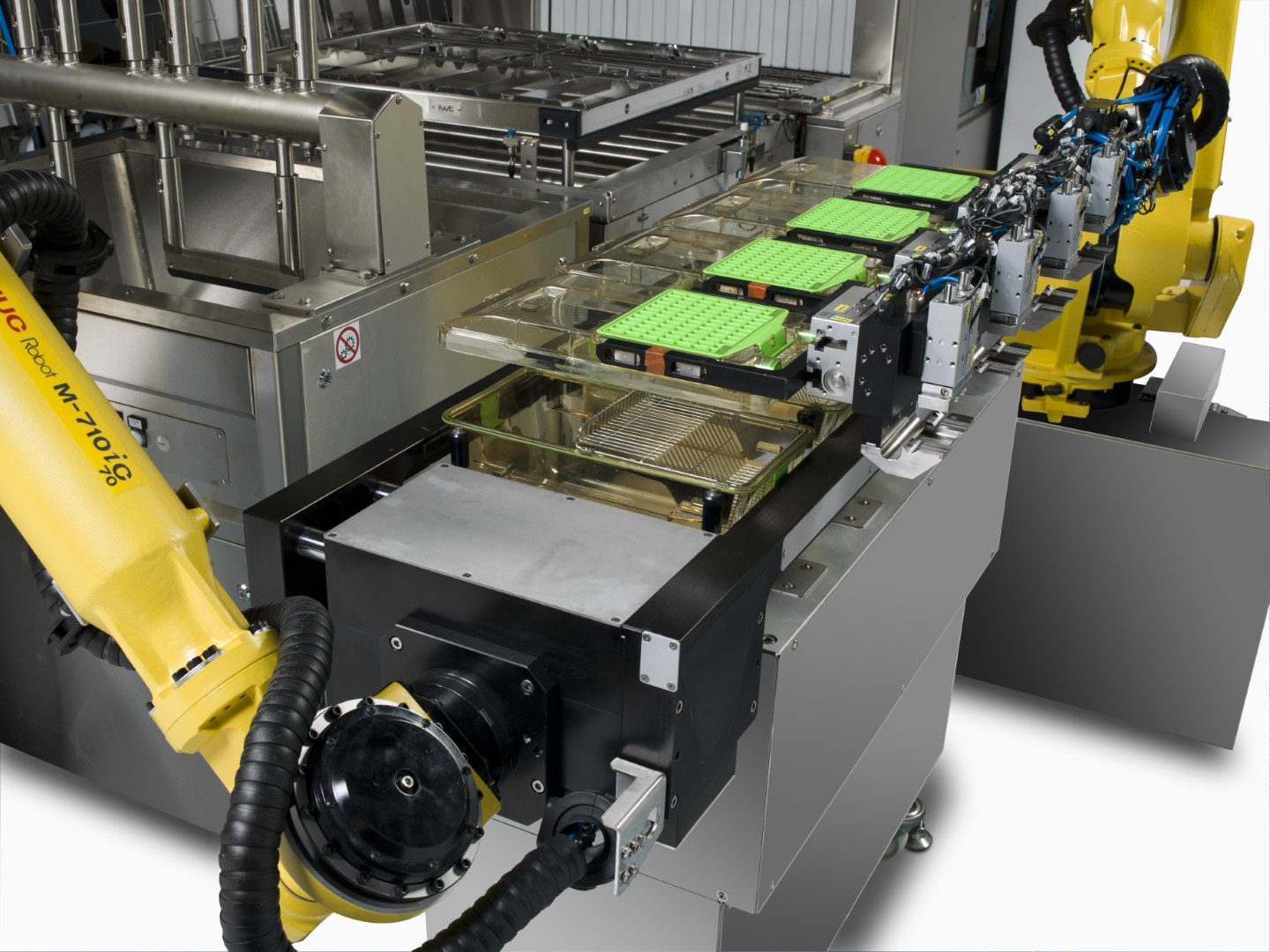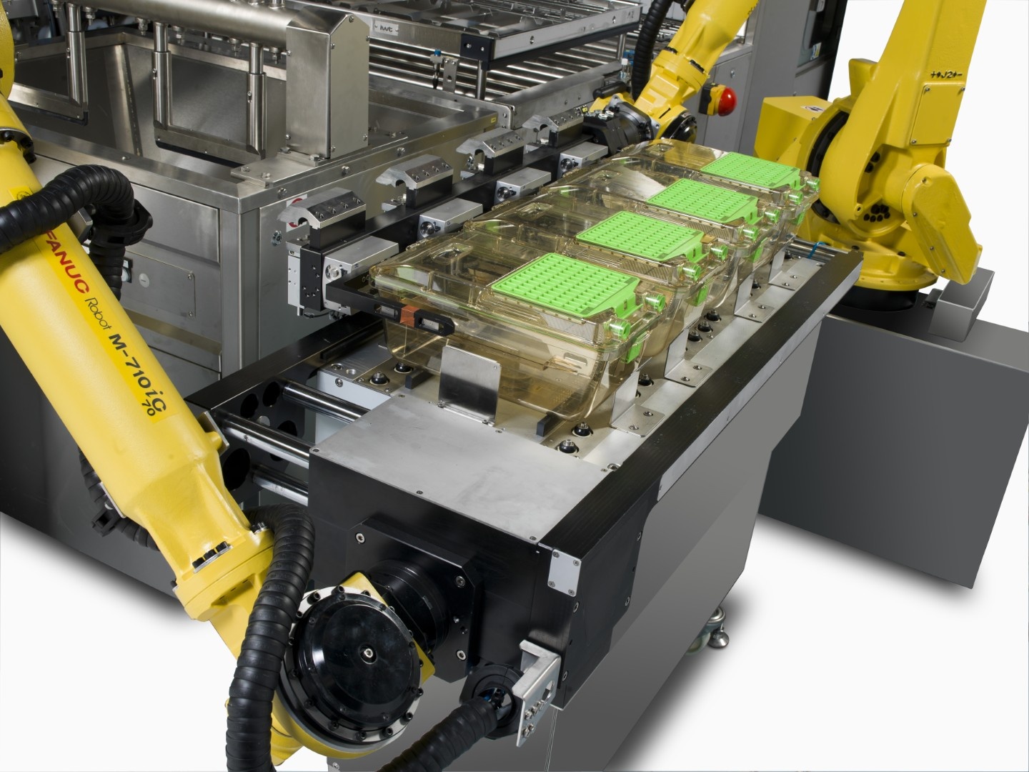 COSMOS współpracuje bezpośrednio ze zmywarką tunelową, która realizuje mycie, płukanie i suszenie elementów klatek. Po zakończeniu procesu robot przejmuje obsługę strony czystej – przekazuje podstawy do systemu dozowania ściółki, precyzyjnie je napełnia, a następnie automatycznie składa kompletne zestawy klatek i odkłada je na czyste wózki transportowe. Cały proces odbywa się w sposób powtarzalny, kontrolowany i w pełni zautomatyzowany.