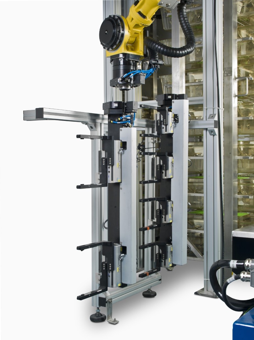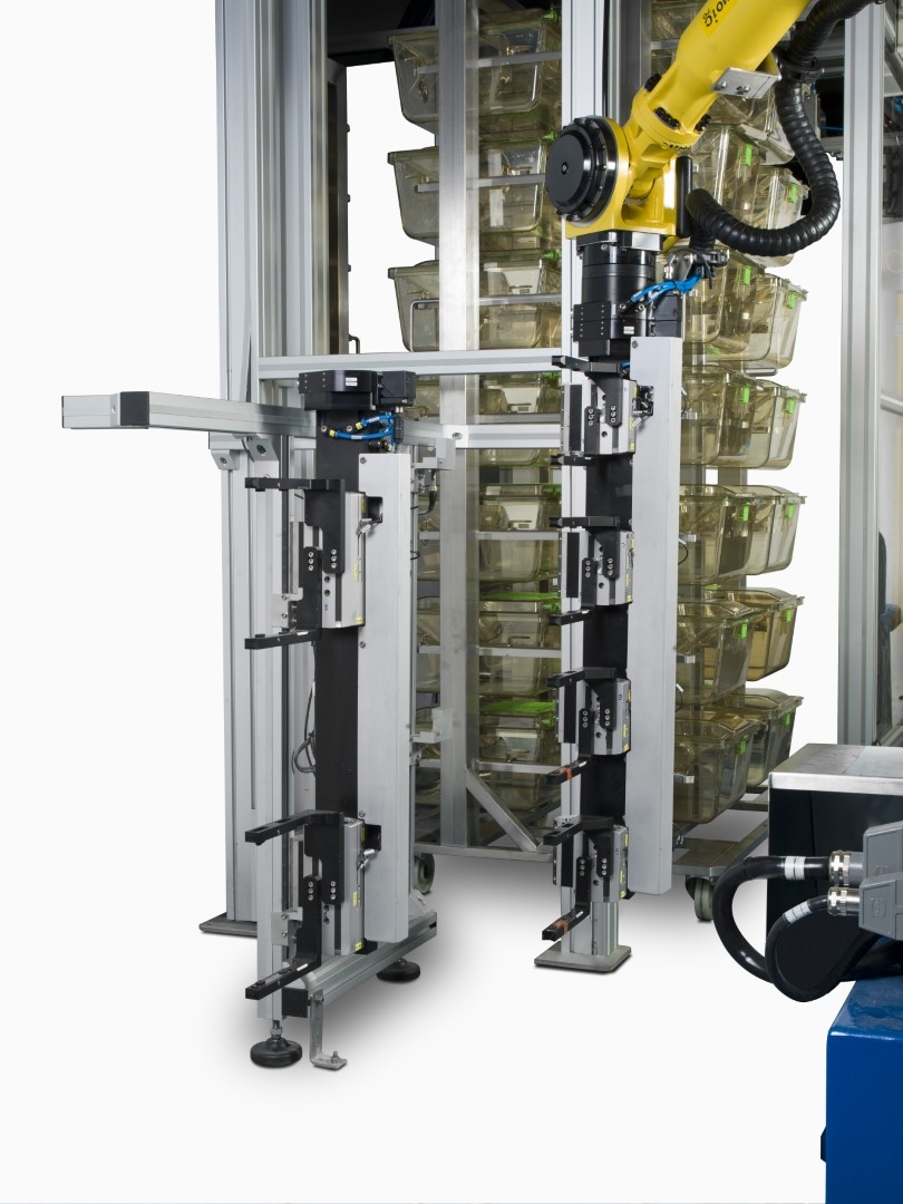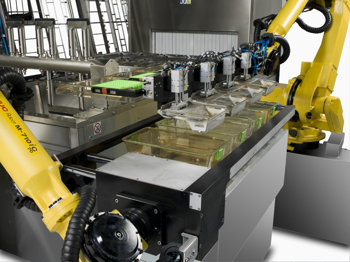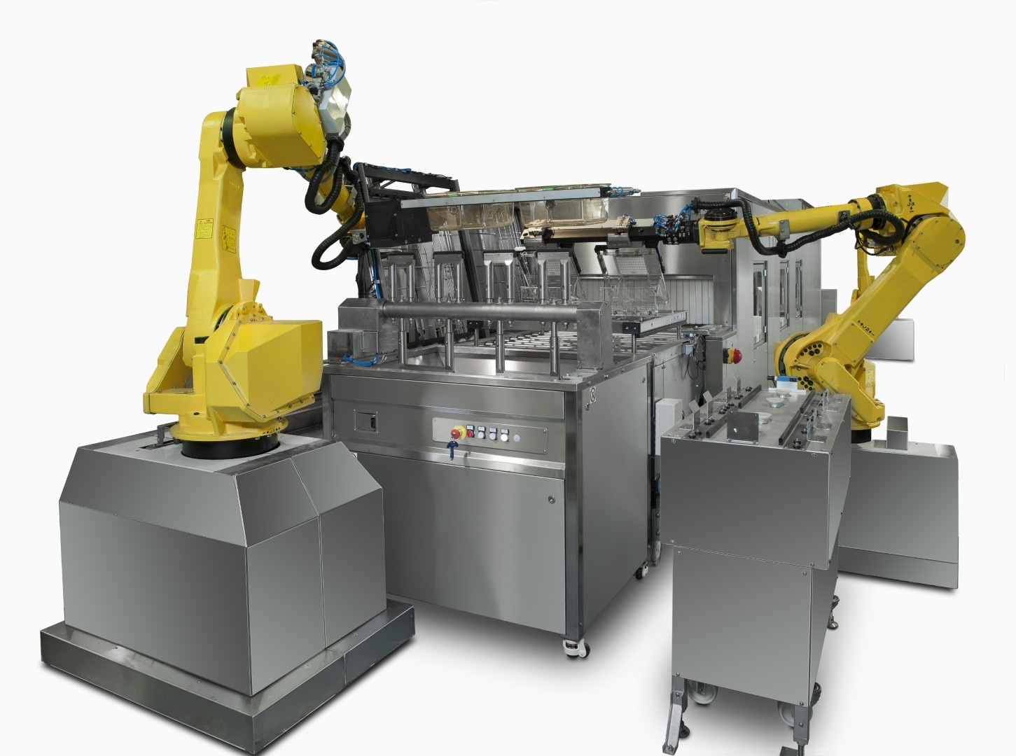 Zastosowanie przemysłowych robotów 6-osiowych oraz zamkniętej celi bezpieczeństwa pozwala znacząco ograniczyć ręczne operacje i ekspozycję operatorów na alergeny. System minimalizuje obciążenie fizyczne personelu, a rola operatora sprowadza się głównie do obsługi logistycznej wózków.
