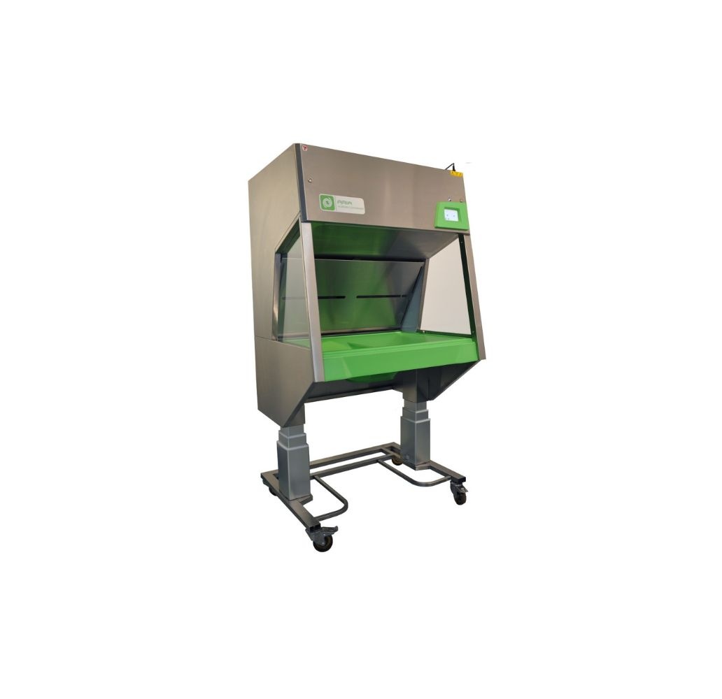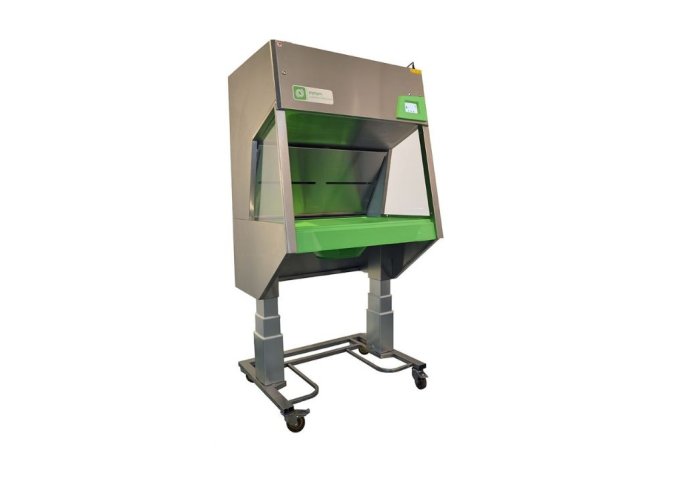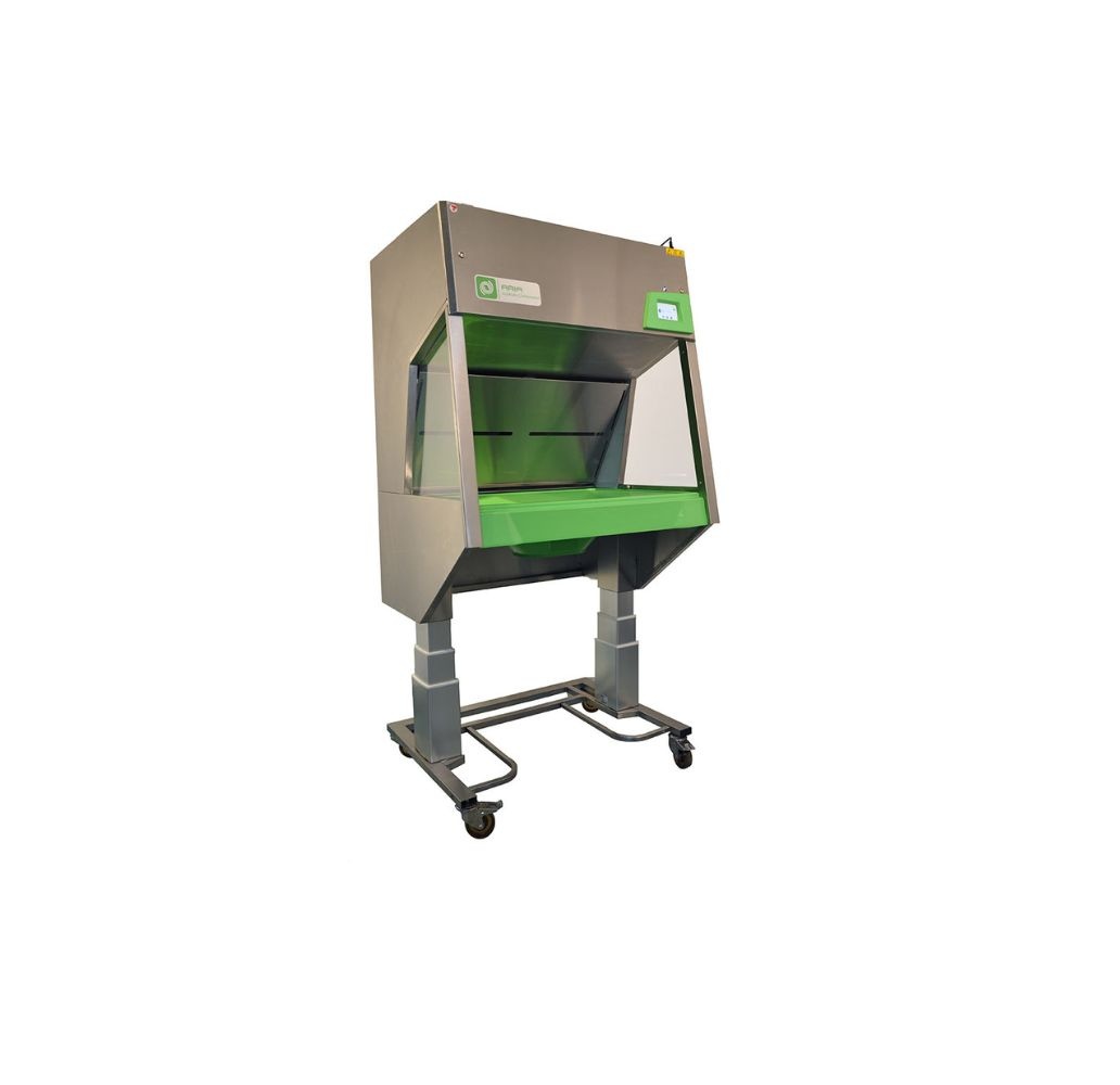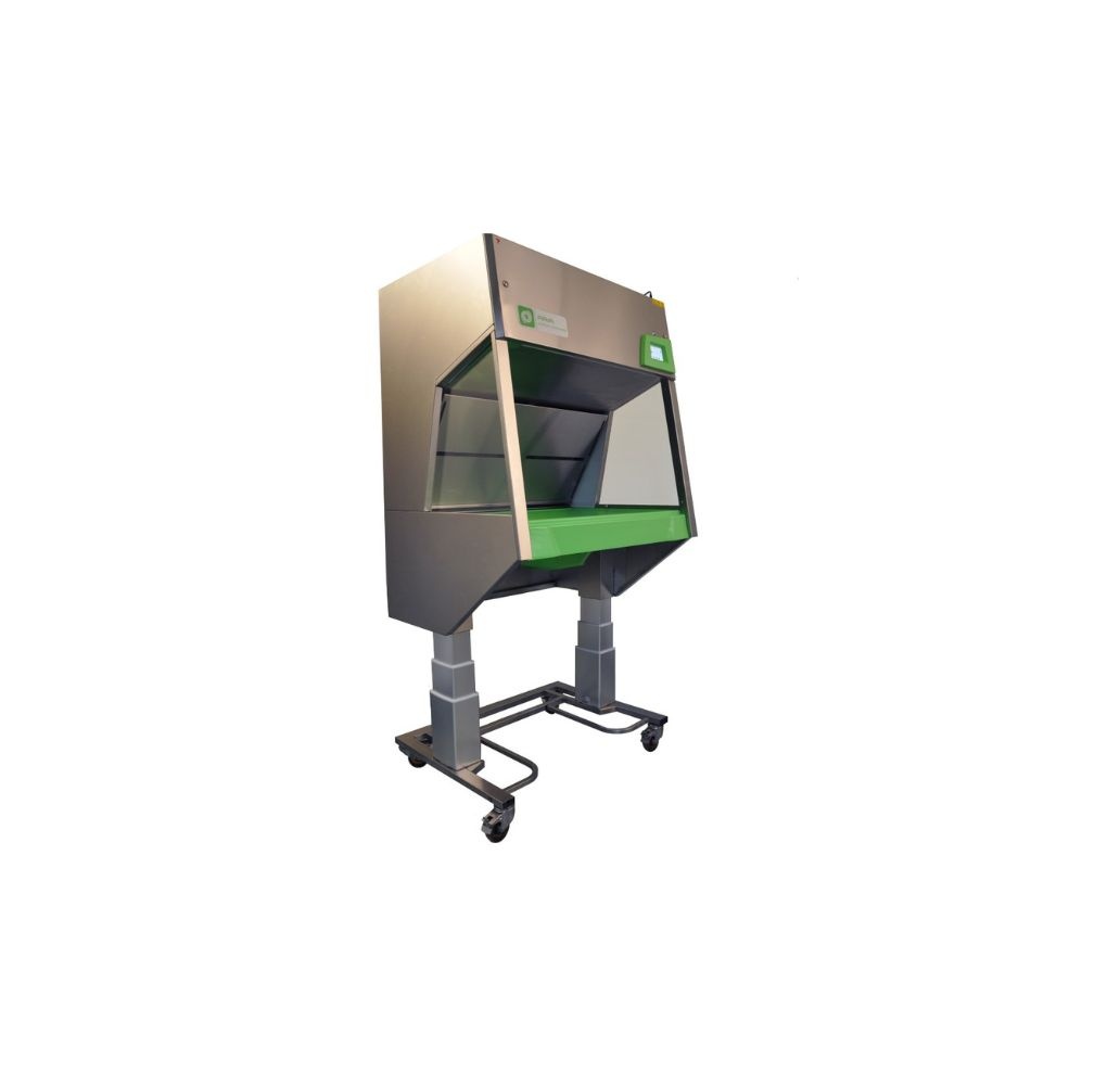 Stacja została zaprojektowana jako rozwiązanie ciche i energooszczędne. Zastosowanie silnika EC oraz zoptymalizowanego plenum redukuje poziom hałasu i zużycie energii, zapewniając komfort użytkowania nawet przy intensywnej eksploatacji. Przestronna komora robocza przy zachowaniu kompaktowych wymiarów zewnętrznych (ok. 1050x895×1880 mm) umożliwia wygodne opróżnianie klatek. Opcjonalny system elektrycznego podnoszenia pozwala dostosować wysokość pracy do użytkownika, poprawiając ergonomię stanowiska.