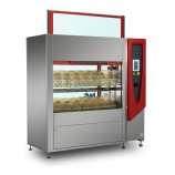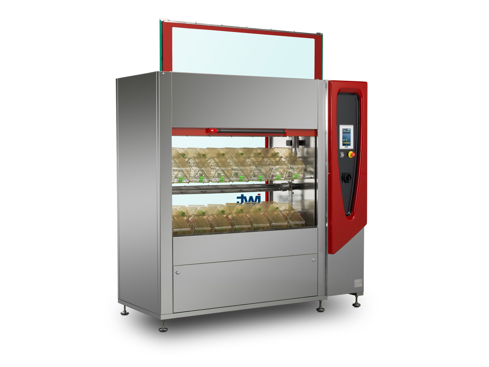 Drzwi z hartowanego szkła na całej wysokości gwarantują pełną kontrolę wizualną procesu oraz bezpieczną pracę w środowiskach barierowych. Wbudowany, regulowany system prezentacji załadunku umożliwia szybkie dopasowanie do różnych typów wsadu i poprawia skuteczność płykanie.