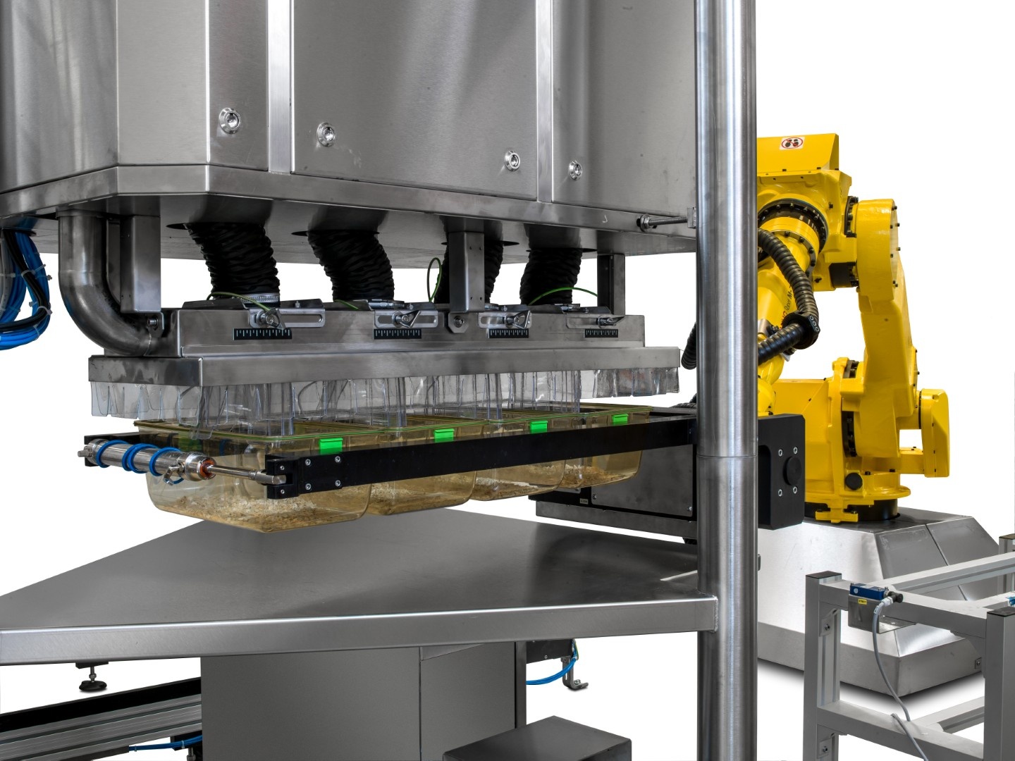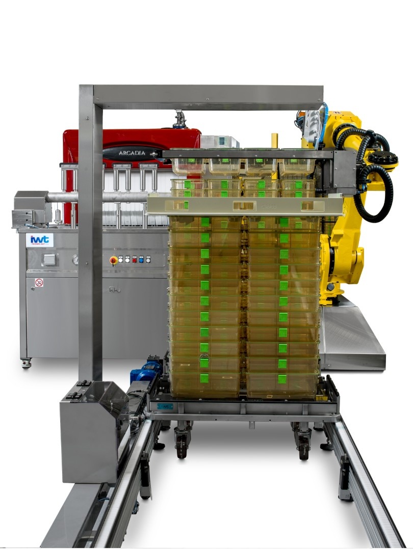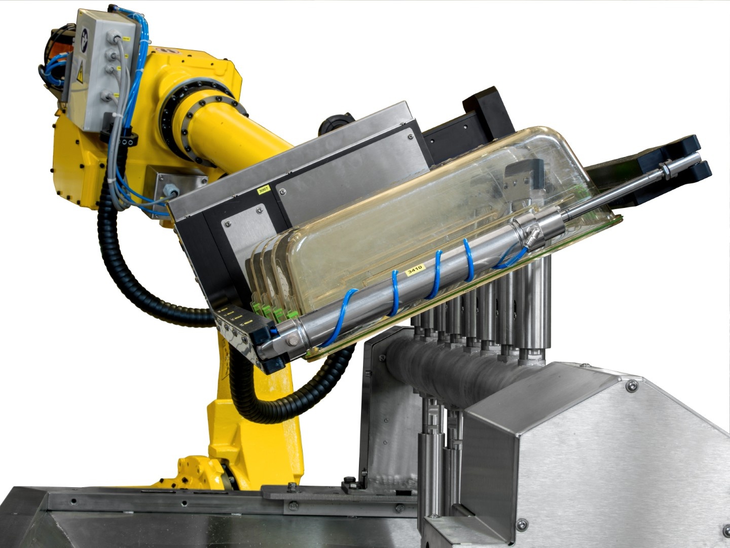Po załadowaniu wózków transportowych robot identyfikuje typ klatek i automatycznie usuwa pokrywy alergenowe, odwraca podstawy oraz wysypuje zużytą ściółkę do zintegrowanego systemu utylizacji. Proces odbywa się w zamkniętej celi robotycznej, co znacząco ogranicza emisję alergenów i poprawia bezpieczeństwo pracy. Oczyszczone podstawy są następnie w sposób ciągły przekazywane do myjni tunelowej, zapewniając wysoką wydajność procesu.