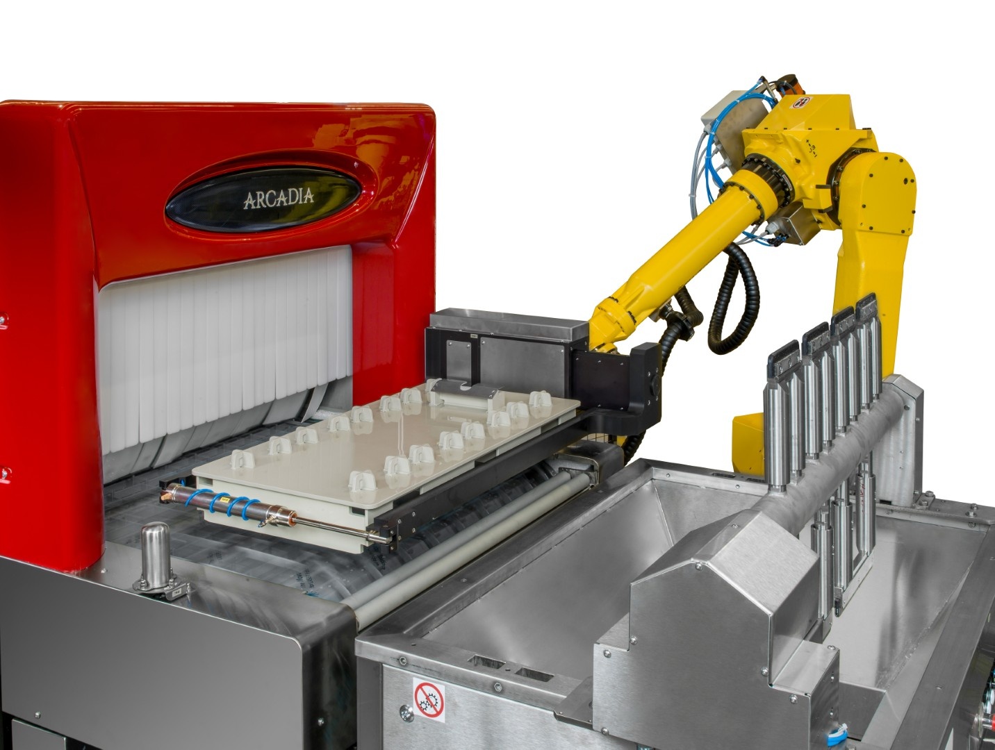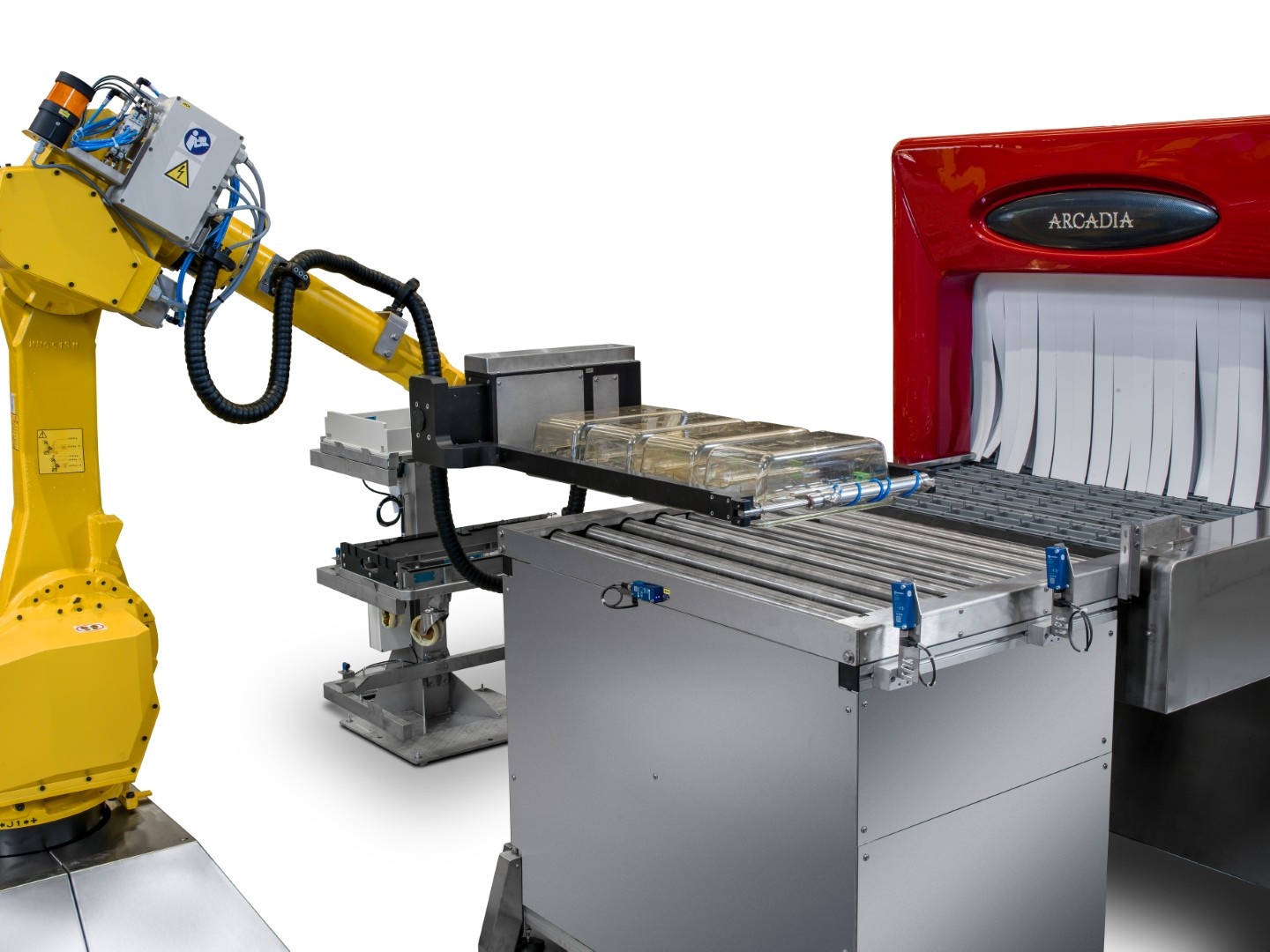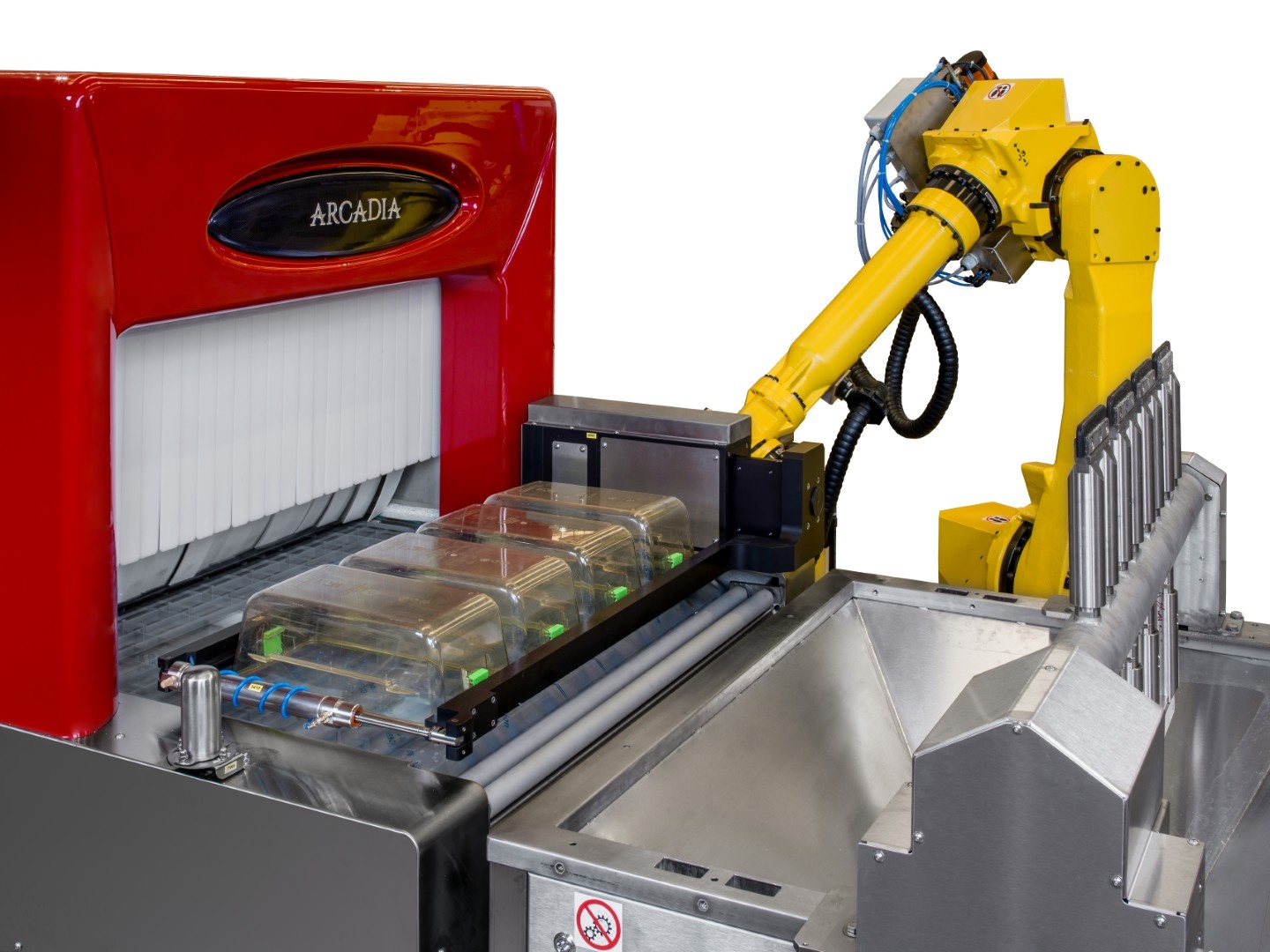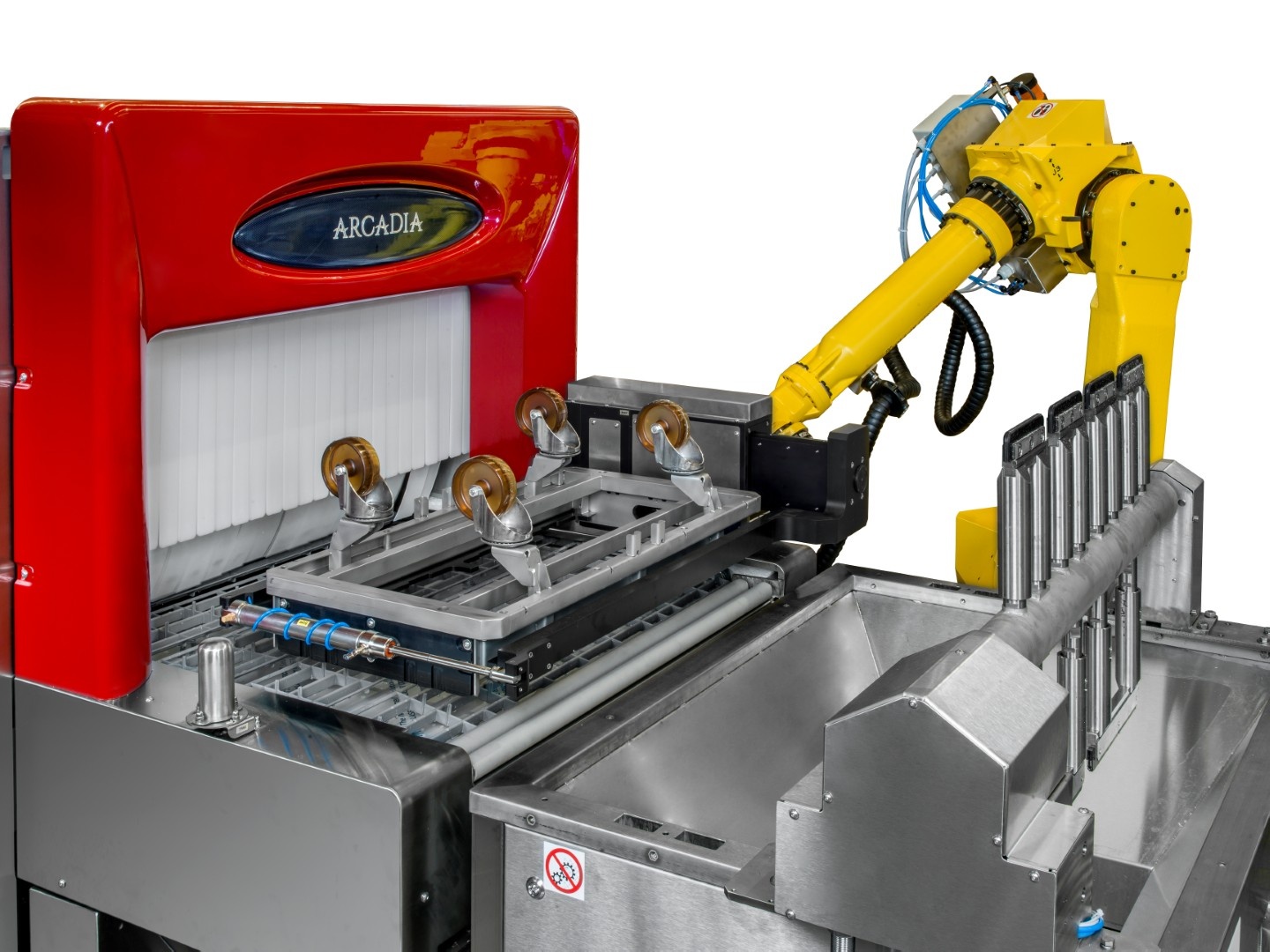 PEGASUS został zaprojektowany do współpracy ze zmywarką tunelowa ARKADIA, umożliwiając płynny załadunek i rozładunek bez przestojów. Po zakończeniu mycia i suszenia robot przejmuje obsługę strony czystej – przekazuje klatki do systemu dozowania ściółki, precyzyjnie napełnia je wybranym materiałem, a następnie kompletuje stosy na czystych wózkach transportowych wraz z pokrywami alergenowymi. Cały proces przebiega automatycznie i powtarzalnie.
